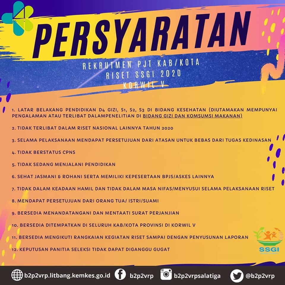 Open Recruitment PJT Kabupaten/Kota Riset Studi Status Gizi Indonesia (SSGI) Tahun 2020 Koordinator Wilayah V Balai Besar Penelitian dan Pengembangan Vektor dan Reservoir Penyakit telah dibuka. Untuk Pendaftaran bisa di klik DISINI.