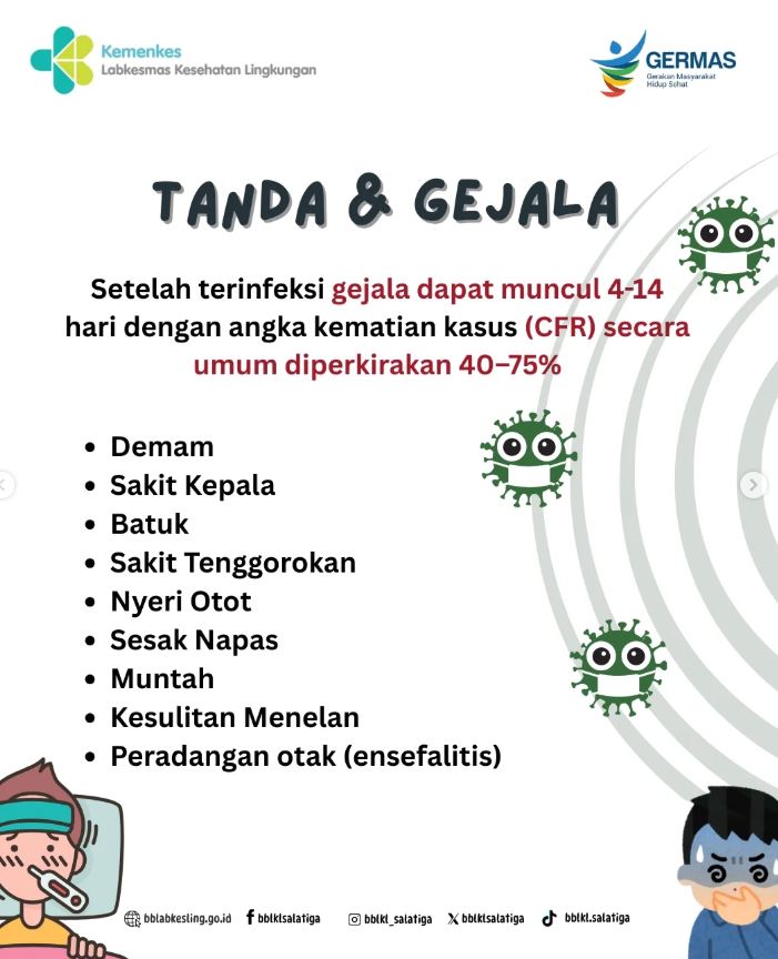 1. Kontak langsung dengan hewan terinfeksi (misalnya kelelawar, babi), atau cairan tubuh hewan seperti darah, urin, air liur, dan feses.
